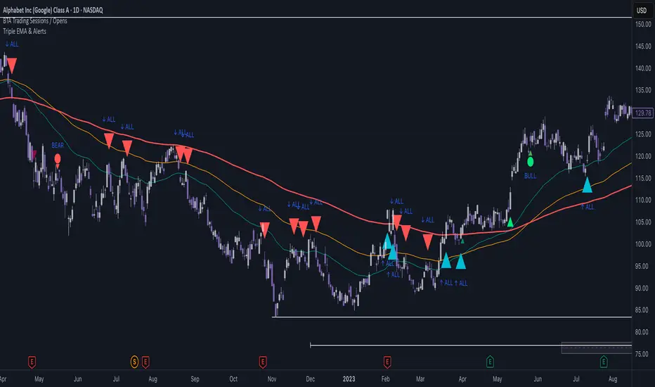 - Triangle Up/Down for EMA1–EMA2, EMA2–EMA3, and EMA1–EMA3 crosses.