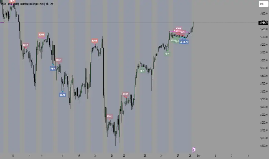A sophisticated multi-timeframe pivot analysis tool that detects and highlights equal highs and equal lows across four different pivot lengths simultaneously. This indicator identifies price levels where the market creates identical extremes, a powerful signal of institutional support/resistance and potential reversal or breakout zones.