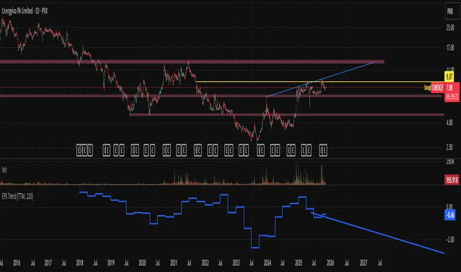 This indicator visualizes a company’s Earnings Per Share (EPS) data directly on the chart—pulled from TradingView’s fundamental database—and applies a dynamic linear regression trendline to highlight the long-term direction of earnings growth or decline.