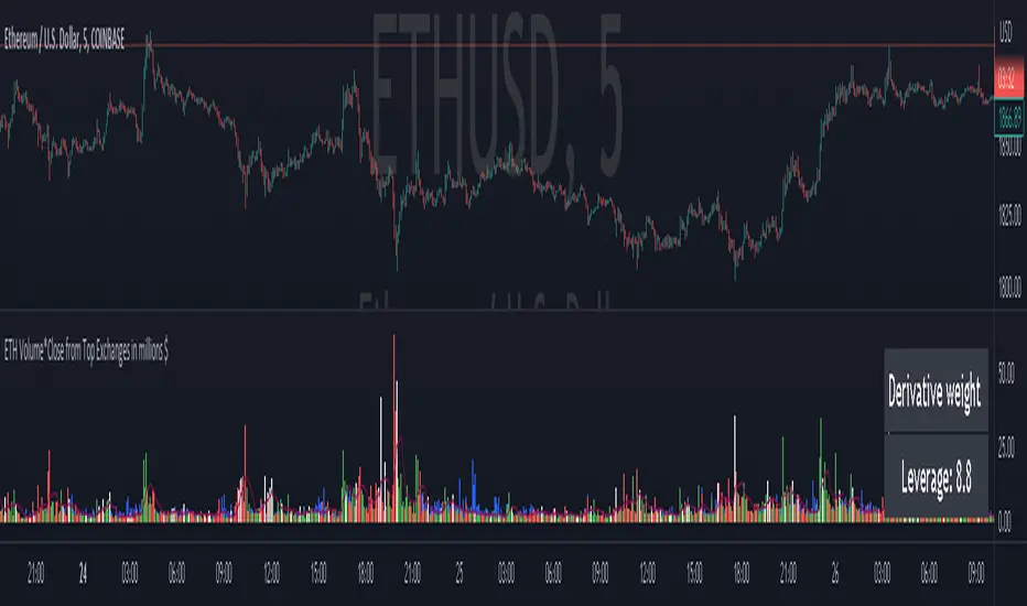 This script is showing the volume-weighted closing price of Ethereum (ETH) from various exchanges, including real and fake volume exchanges. The script calculates the total volume across all exchanges and multiplies it by the closing price to obtain the volume*close value in millions of dollars. The script also calculates the derivative weight and leverage factor based on the difference between the real and fake volume exchanges. Additionally, the script checks if the volume is rising but the price is lower than the previous five bars high and higher than the previous five bars low. If this is the case, the histogram bars are plotted in white. The script also plots the SMA (Simple Moving Average) of the volume*close values and displays a table with the derivative weight and leverage factor.Informacje o Wersji
