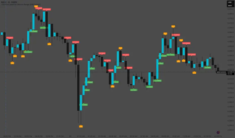 This script provides a session-aware Cumulative Volume Delta (CVD) analysis designed to enhance the “Session Ranges [AMT Edition]” framework by combining price extremes with detailed volume flow dynamics. Unlike generic trend or scalping indicators, this tool focuses on identifying aggressive buying and selling pressure, distinguishing between absorption (failed auctions where aggressive flows are rejected) and acceptance (confirmed continuation of flows).