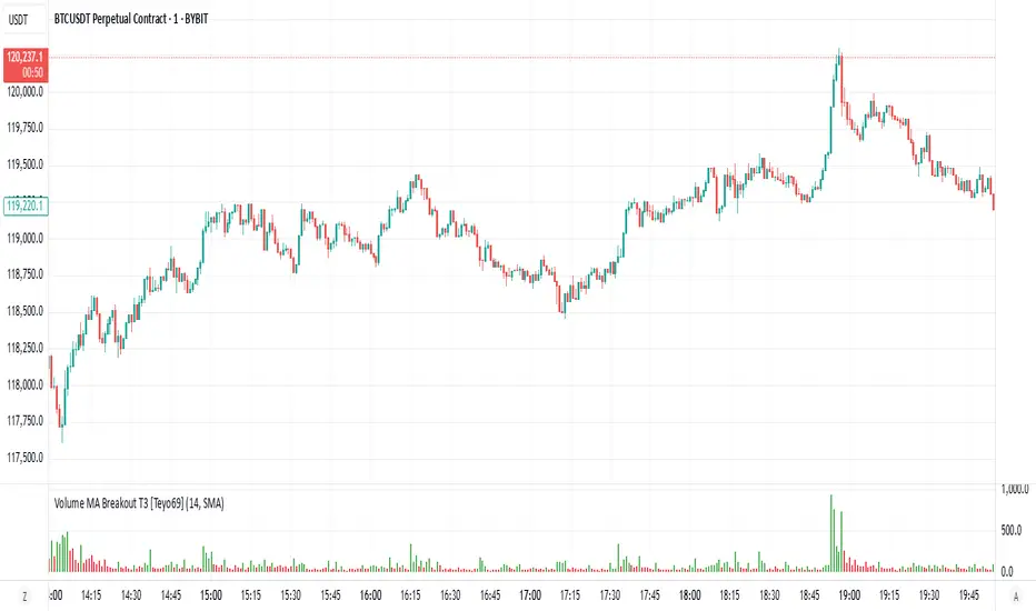 Volume MA Breakout T3 [Teyo69] highlights volume bars that exceed a dynamic moving average threshold. It helps traders visually identify volume breakouts—periods of significant buying or selling pressure—based on user-selected MA methods (SMA, EMA, DEMA).