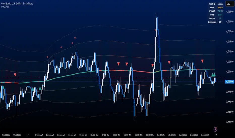 This indicator applies Kalman filtering techniques to Volume Weighted Average Price (VWAP) calculations, providing a statistically optimized approach to VWAP analysis. The Kalman filter reduces noise while maintaining responsiveness to genuine price movements, addressing common VWAP limitations in volatile or low-volume conditions.