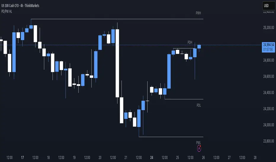 This indicator automatically plots the previous day’s and previous week’s Highs and Lows, giving you instant clarity on the most important market liquidity levels. These levels often act as magnets for price and serve as key decision zones for intraday and swing traders.