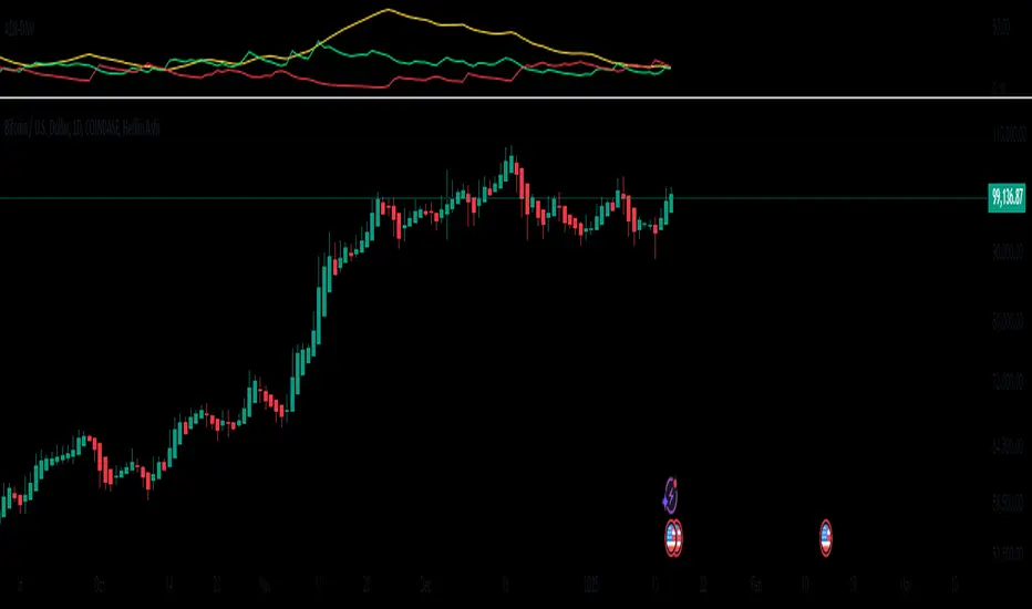 This script manually calculates the Directional Movement Index (DMI) and the Average Directional Index (ADX) using Wilder’s smoothing technique. The DMI indicators are used to assess the strength and direction of a market trend. It includes three main lines: ADX (yellow), DI+ (green), and DI− (red). Traders use these indicators to determine whether a trend is strong and in which direction it is moving.