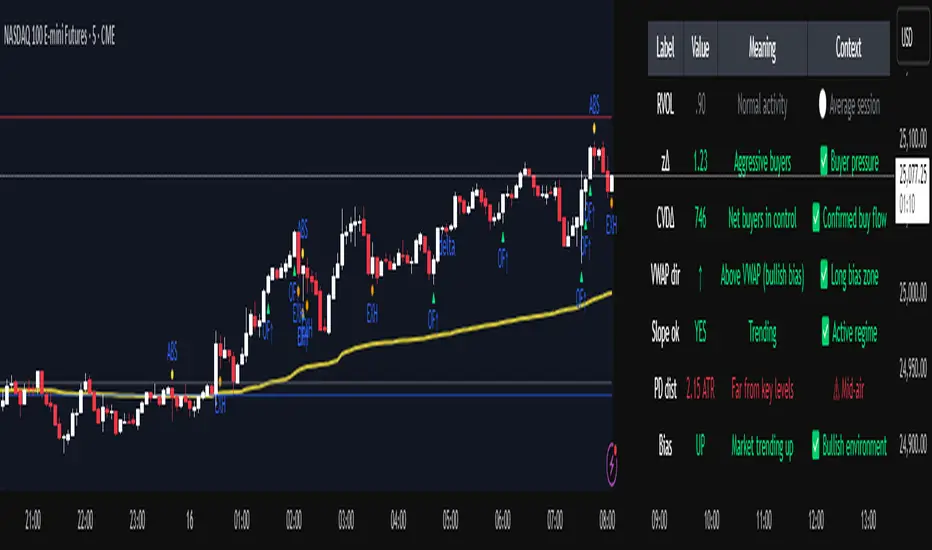 Unlike traditional volume-based indicators, it merges VWAP dynamics, cumulative delta, relative volume, and liquidity proximity into a single unified dashboard that updates tick-by-tick — without repainting.