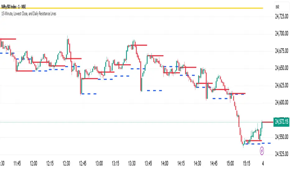 Lowest Close Resistance: A dashed blue line drawn at the lowest closing price within each 15-minute interval.