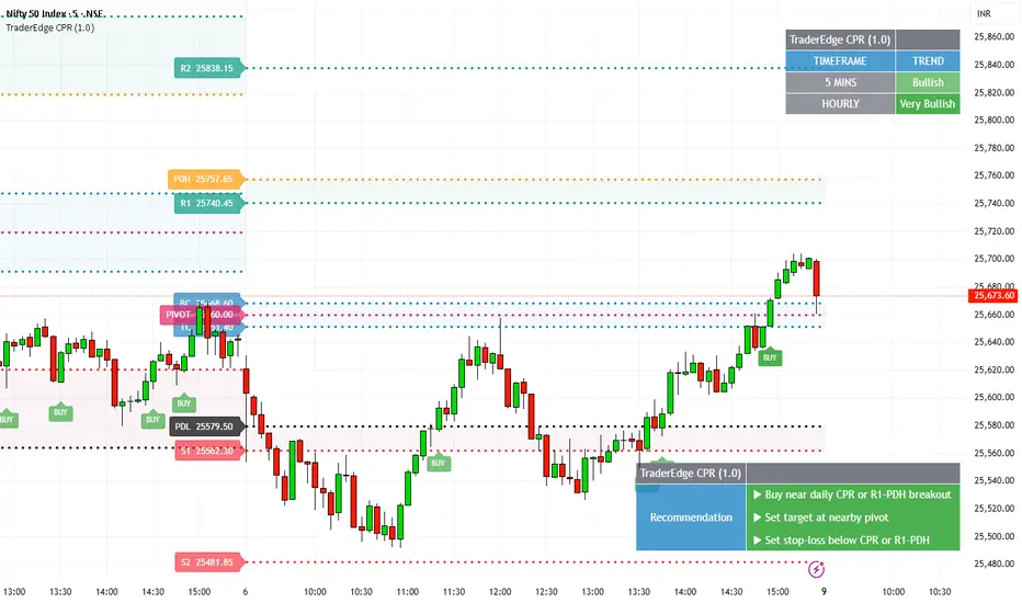When higher timeframe trend is bullish the recommendation engine alerts when and where to buy on dips. i.e 1. Near CPR support , R1 PDH Breakout or S1-PDL support