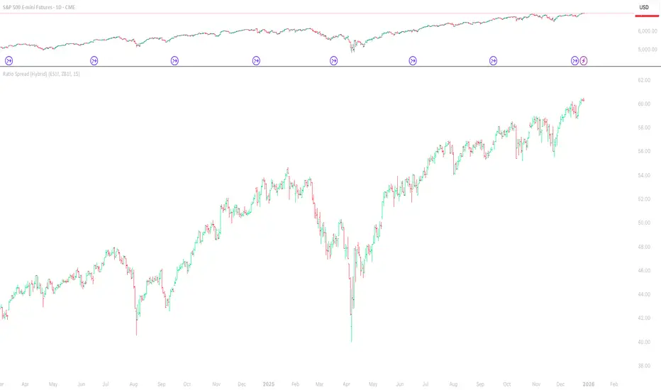 Ratio Spread (Hybrid) plots a daily OHLC “spread candle” built from the price ratio of two instruments:
