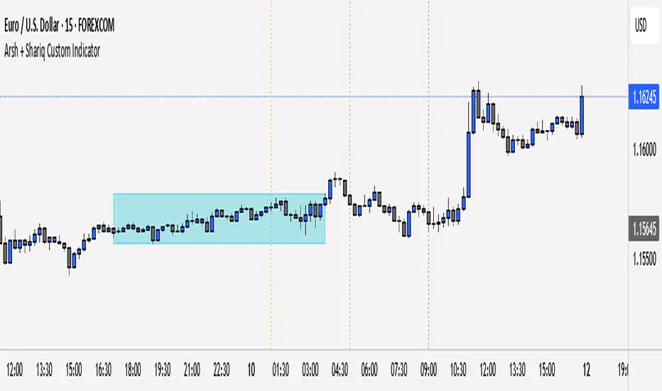 Purpose:An indicator created by me (Shariq). I have made a customized indicator in which I deployed important sessions and time as taught by my Mentor Arsh Siddiqui.' This indicator is mainly developed to honor my Mentor Arsh. Moreover, to help him and his students.