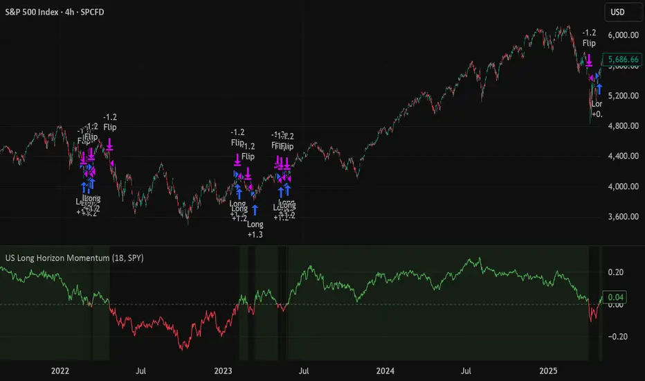 US Market Long Horizon Momentum is a trend following strategy for US index ETFs and futures built around a single eighteen month time series momentum measure. It helps you stay long during persistent bull regimes and step aside or flip short when long term momentum turns negative.