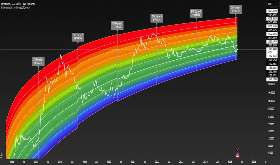 The ETH Growth Rainbow [AlchimistOfCrypto] transcends traditional price prediction models with a sophisticated multi-band illumination system that reveals the underlying structure of Ethereum's monetary evolution. Scientifically calibrated across multiple 85-week cycles (detected through spectral analysis) and featuring seamless rainbow visualization, it enables investors to perceive Ethereum's position within its macro growth trajectory with unprecedented clarity.