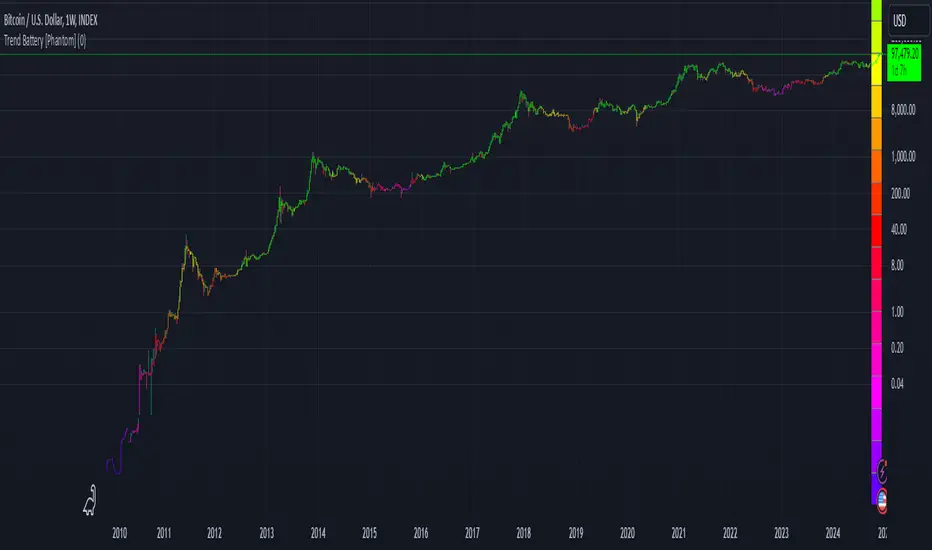 Trend Battery [Phantom] calculates 20 EMAs and evaluates their alignment. When EMAs align in a strong trend, the bar colors change (as displayed in battery color key on chart) displaying a spectrum of colors from bright green (strong uptrend) to deep purple (strong downtrend).