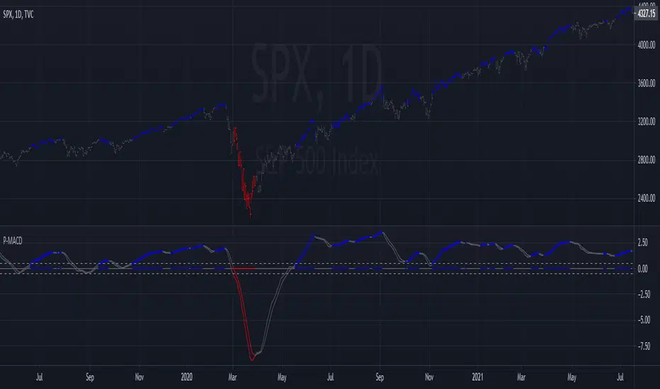 This MACD is calculated using percentage above or below the zero line for consistency and compatibility across different stocks and markets. The price bars are colored when MACD is above/below extreme levels and crossed in that direction. The intention is to use this setting on a longer time frame and trade only in the direction the bars are colored. This setting is also a powerful way to take profits! As usual, my scripts are public for scrutiny and to adjust for your personal needs.