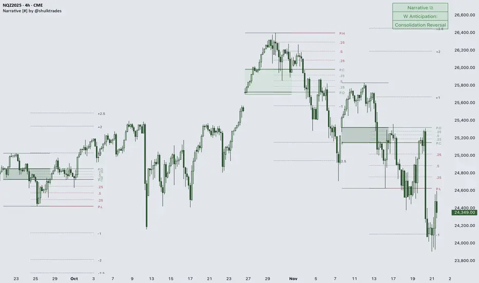 Narrative, is a multi-timeframe technical analysis indicator that provides anticipative candle structure analysis by identifying and visualizing higher timeframe (HTF) price levels based on candle composition dynamics. The indicator calculates hierarchical price zones derived from candle body proportions and wick ranges, then projects these levels as support/resistance quadrants and standard deviation-based extensions for the current and subsequent timeframe periods.