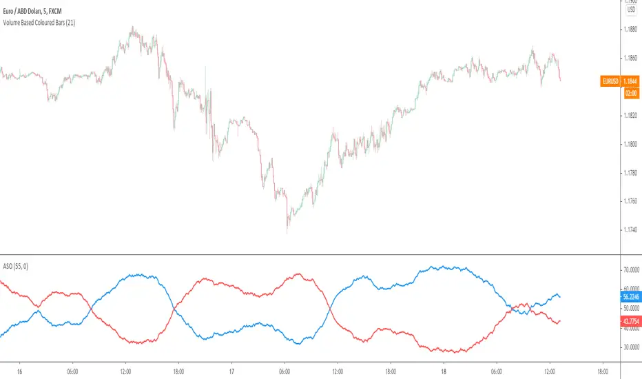 It’s a combination of two algorithms, both essentially the same but applied in a different way. The first one analyzes the bullish/bearishness of each bar using OHLC prices then averages all percentages in the period group of bars (eg. 10) to give the final % value. The second one treats the period group of bars as one bar and then determines the sentiment percentage with the OHLC points of the group. The first one is noisy but more accurate in respect to intra-bar sentiment, whereas the second gives a smoother result and adds more weight to the range of price movement. They can be used separately as Mode 1 and Mode 2 in the indicator settings, or combined as Mode 0.