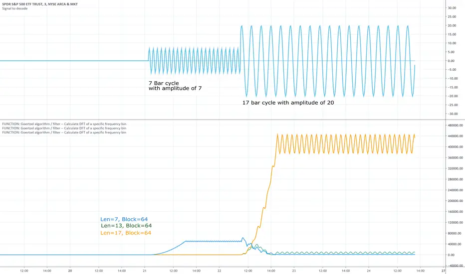 Here you see an input signal that changes frequency and amplitude (from 7 bars to 17). I am running the indicator 3 times to show it measuring both frequencies and one in between (13). You can see it very accurately measures the signals present and their power, but is noisy in the transition. Changing the block len will cause it to be more responsive but noisier.