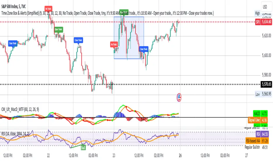 - **Custom Alerts**: Users can define custom alert messages for specific times within the trading day (e.g., before and after the trading range). Alerts are triggered once per bar close at the specified times.