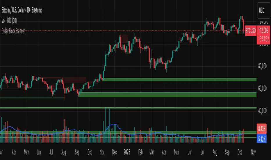 This script scans for order blocks. An order block in the bullish case is a red candle that leads to two upward candles with a FVG inbetween, and in the bearish case, it's a bullish candle that leads to two downward candles with a FVG inbetween.