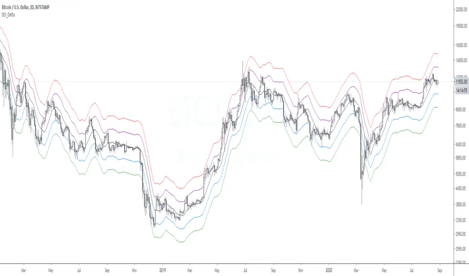 The DD_Delta Indicator is a mean reversion indicator based on the concept of moving average and fibonacci level multiples. The middle blue line corresponds to the 13 MA with the orange and red lines lines being a factor and inverse of 1.414 and 1.272 of the blue line respectively. Price usually retraces from the purple and red (green and blue) lines towards the back line. Also, the direction of the ribbon indicates the nature of the market - upwards: bull, downwards, bear.