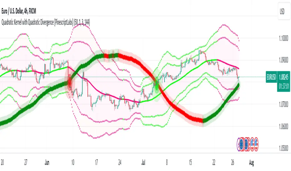 Quadratic Kernel Regression calculates a smoothed central line based on recent prices.