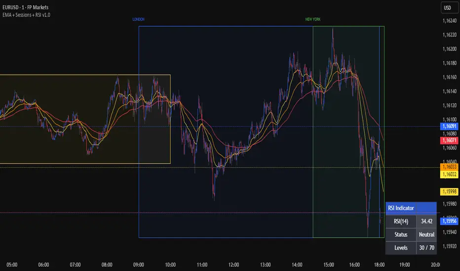 This is a simple on-demand indicator. It includes 3 customizable exponential moving averages, three customizable market sessions, and a table showing the status of the RSI
