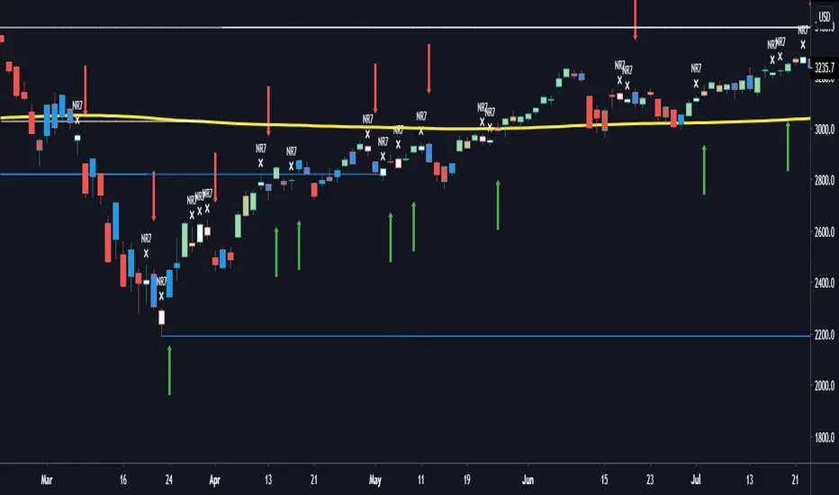 Every "NR7" will show up on the chart with a cross symbol and text next to it, then green arrowups show bullish signals and red arrowdowns show bearish signals. Bulkowski also added a "CPI" index on his NR7 strategy, this indicator does not include that "CPI equation" for simplicity purposes and other time frame tradings other than just weekly signals. Please like and share this script, let me know if any questions, thanks!
