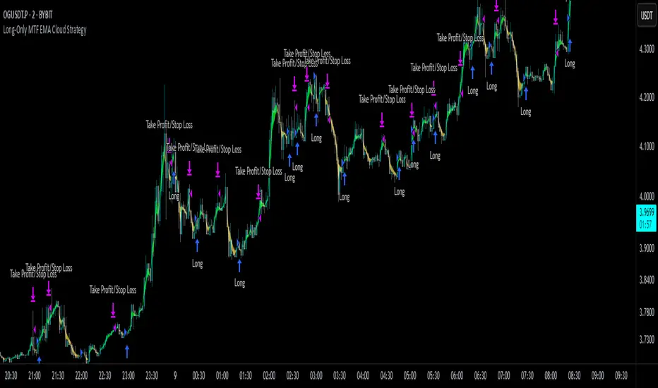 The Long-Only EMA Cloud Strategy is a powerful trend-following strategy designed to help traders identify and capitalize on bullish market conditions. By utilizing an Exponential Moving Average (EMA) Cloud, this strategy provides clear and reliable signals for entering long positions when the market trend is favorable. The EMA cloud acts as a visual representation of the trend, making it easier for traders to make informed decisions. This strategy is ideal for traders who prefer to trade in the direction of the trend and focus exclusively on long positions.