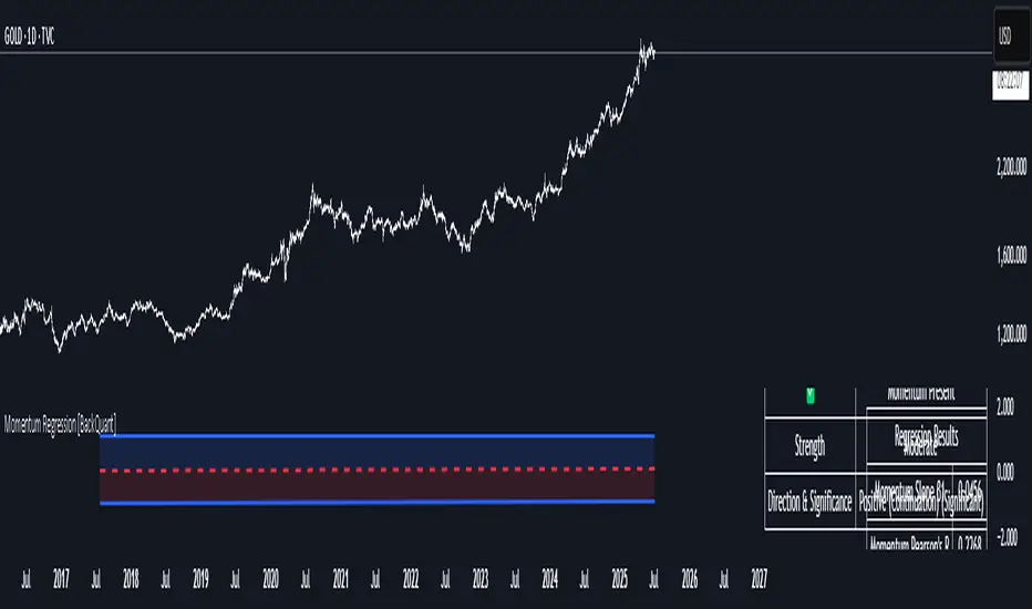 The Momentum Regression is an advanced statistical indicator built to empower quants, strategists, and technically inclined traders with a robust visual and quantitative framework for analyzing momentum effects in financial markets. Unlike traditional momentum indicators that rely on raw price movements or moving averages, this tool leverages a volatility-adjusted linear regression model (y ~ x) to uncover and validate momentum behavior over a user-defined lookback window.