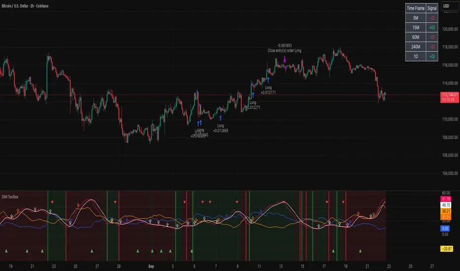 The indicator can offer a myriad of signals for building a trading strategy. In an effort to provide the user with a meaningful way to evaluate these signals, this DMI Toolbox Strategy offers the chance to back-test various combinations and permutations of DMI signals on long trades. By default it will open a long position on the +DI (upward movement) crossing above the -DI (downward movement). By default, It exits long positions when the ADX (trend strength) reverses.