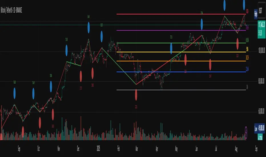 - Fibonacci retracements are always drawn from the highest high and lowest low of the last 200 bars (rolling window), independent of swing labels.