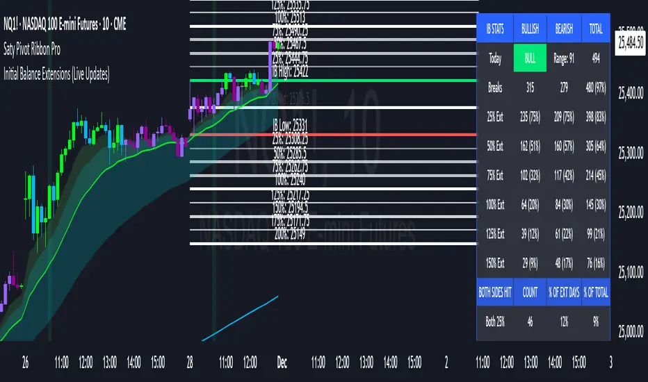 Tracks the Initial Balance (IB) range formed during the first hour of trading (9:30-10:30 AM EST) and projects extension levels to identify potential price targets throughout the session.