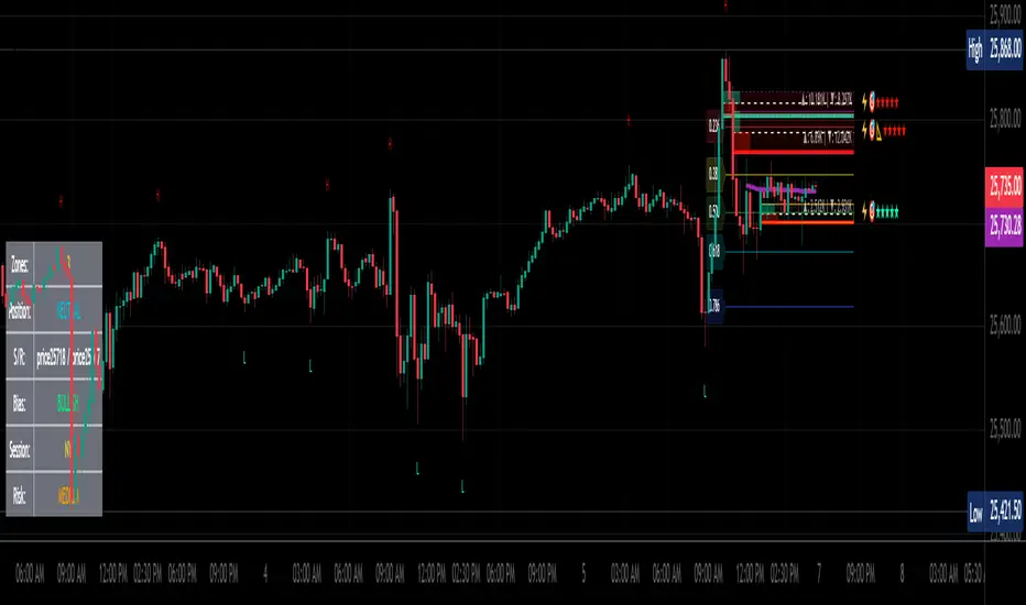 Compresses the whole environment into a real-time Info Table: bias, market position, nearest S/R, risk, session