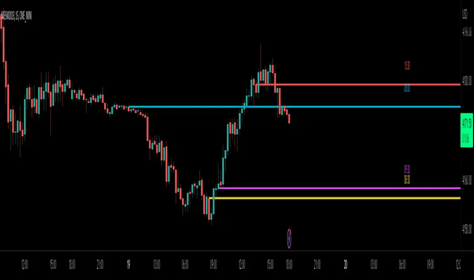 Opening lines can be used to monitor for power of 3/judas swings as per ICT teachings. The script allows the user to set a maximum timeframe for displaying the lines to keep HTF charts clean. Also an option is available to hide the lines after the market closes. If the hide option is used, the lines will be removed at 23:00.
