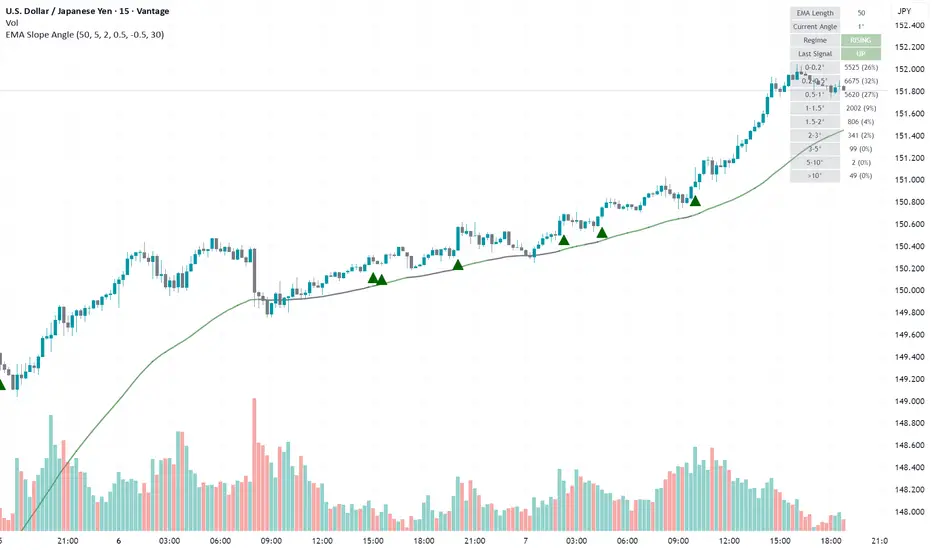 A professional, non-repainting overlay indicator that visualizes EMA slope strength as an angle in degrees, providing instant visual feedback through dynamic EMA coloring and comprehensive trend analysis.