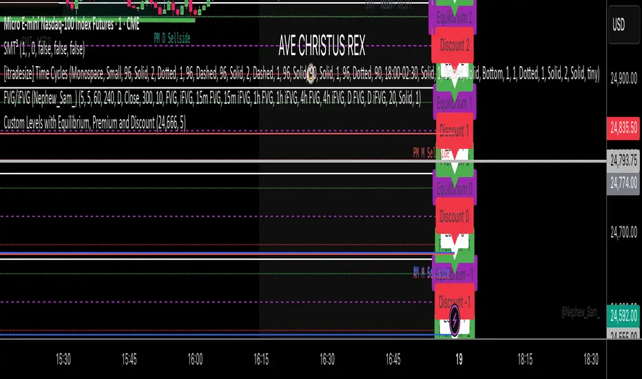 This indicator will show you levels based on the price you enter. Each level is 111 points apart. In the middle of this range, there is an equilibrium at 50%, and 37 points above and below this equilibrium, there are discount and premium zones.