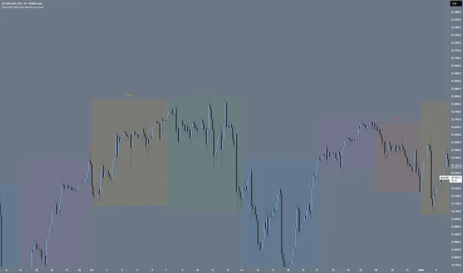 Sakalau02 Monthly Weekly Sessions is a visual analysis tool designed to automatically identify and highlight the 5 weeks of each calendar month. The indicator tracks price action throughout each week and offers several display modes:
