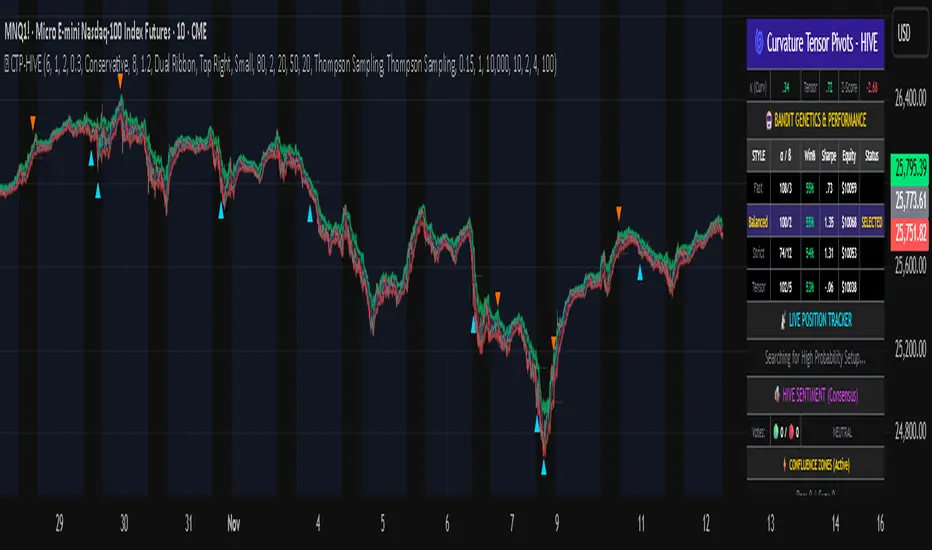 Curvature Tensor Pivots - HIVE is an advanced, multi-dimensional pivot detection system that combines differential geometry, reinforcement learning, and statistical physics to identify high-probability reversal zones before they fully form. Unlike traditional pivot indicators that rely on simple price comparisons or lagging moving averages, this system models price action as a smooth curve in geometric space and calculates its mathematical curvature (how sharply the price trajectory is "bending") to detect pivots with scientific precision.
