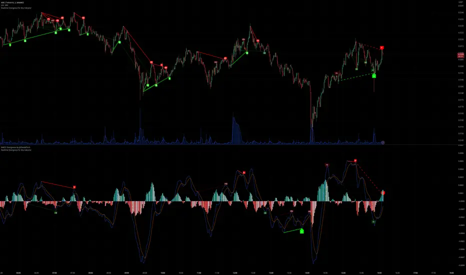 This indicator is an addon to any oscillating indicator. It shows divergences. It shows realtime divergences too. Realtime divergences are potential divergences because the actual pivot is not fully formed.