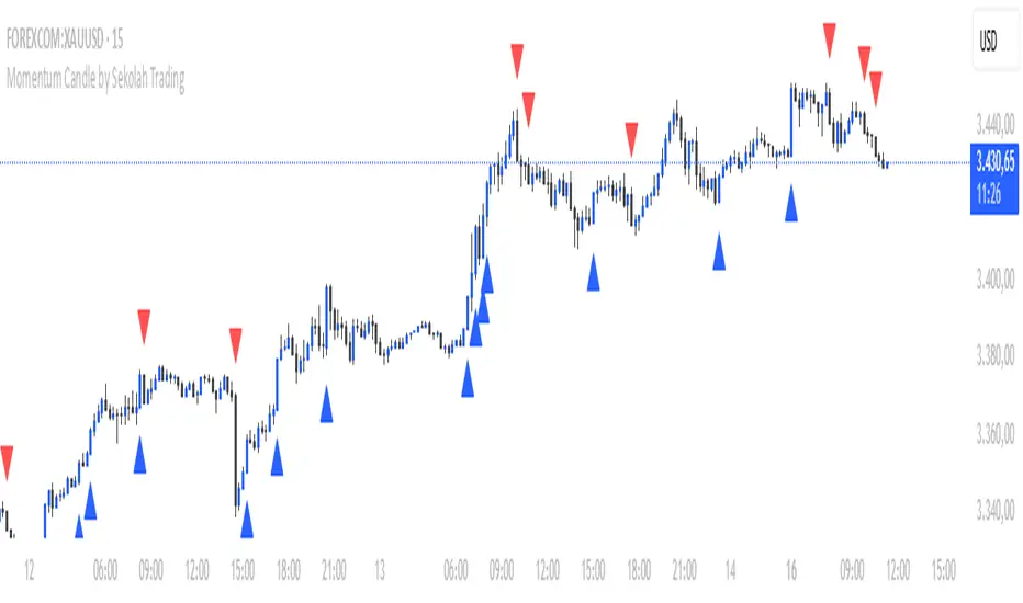 **Momentum Candle by Sekolah Trading** is a proprietary price action tool that identifies high-conviction candles with large bodies and minimal wicks, based on dynamically adjusted thresholds tailored to each pair and timeframe. This script helps traders recognize moments of price acceleration that often precede breakouts, trend continuation, or sharp reversals.