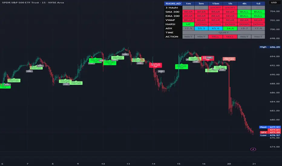 - [] MTF Dashboard: A real-time heads-up display monitoring 1m, 5m, 15m, 1h, 4h, and 1D timeframes. [] Trend Confluence Algorithm: Signals are generated only when Heikin Ashi structure aligns with SMA 200, EMA 200, and VWAP. [] ADX Volatility Engine: Color-coded ADX cells to filter out chop and highlight extreme momentum. [] Session Awareness: Automatically flags the "Opening Mess" and specific trading sessions to provide context.