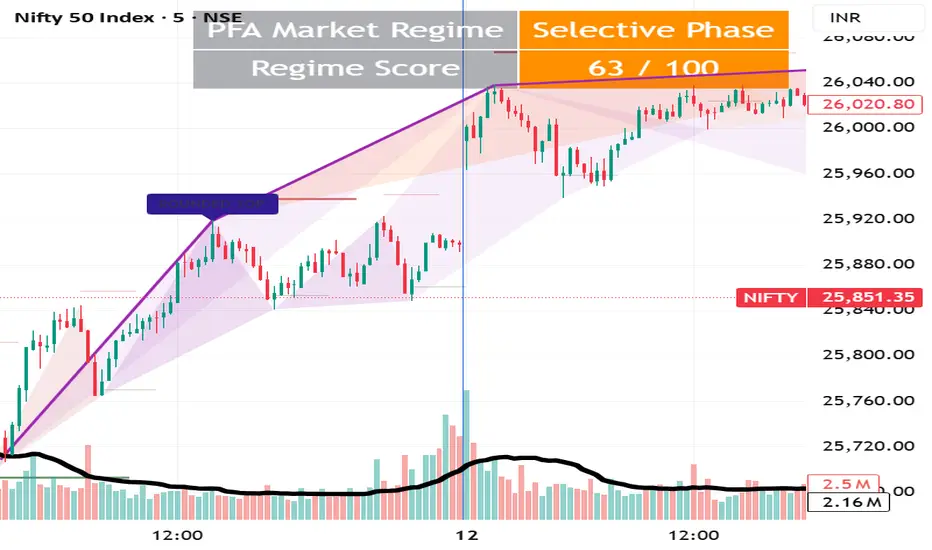 PFA बाज़ार दर्शन™ is a proprietary market regime and structure indicator designed to provide traders with a comprehensive view of market dynamics. Unlike traditional indicators that focus solely on price direction, this tool evaluates both momentum and structural context to determine the underlying market condition.