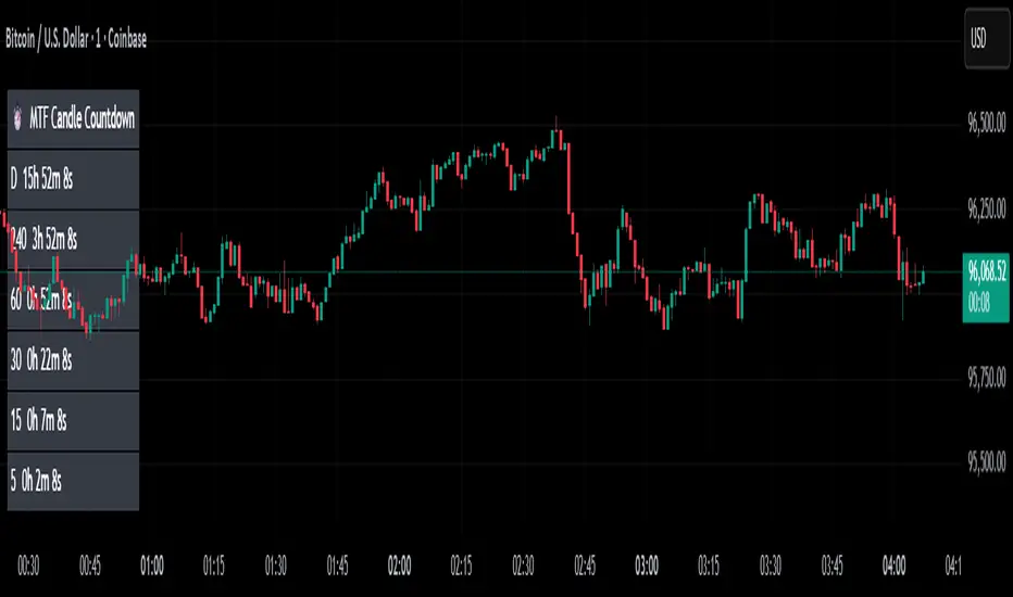 A clean, lightweight HUD that shows you exactly how much time is left in multiple higher-timeframe candles — all in one place.