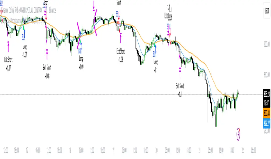 Picture two cheetahs on a racetrack made of price candles. One cheetah is fast and twitchy (the short-term EMA). The other is chill, lumbering, and takes its sweet time (the long-term EMA). When the twitchy cheetah sprints ahead and crosses above the chill one → “BUY, YOU MAGNIFICENT DEGEN!” When the twitchy one gets tired, slows down, and gets lapped from above → “SELL before this turns into a horror movie!”