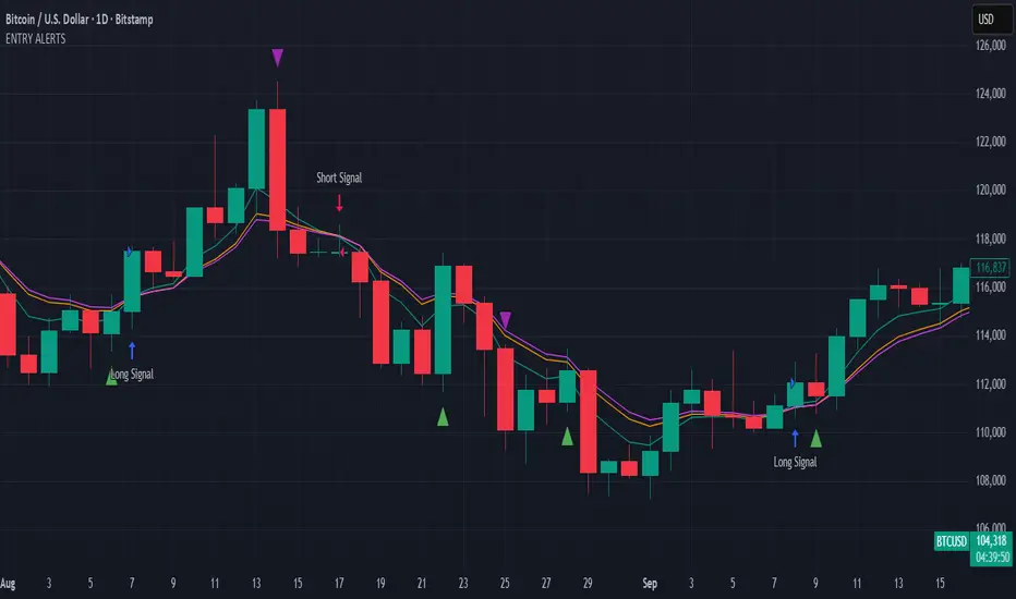 • After a **green trio**, the script can wait for a bullish EMA cross to confirm a **LONG entry**.