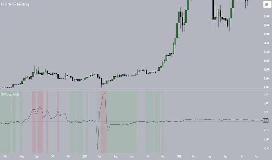 This indicator plots the spread between the Effective Federal Funds Rate (FEDFUNDS) and the 3-Month US Treasury Bill yield (US03MY), used here as a proxy for the SOFR spread.
