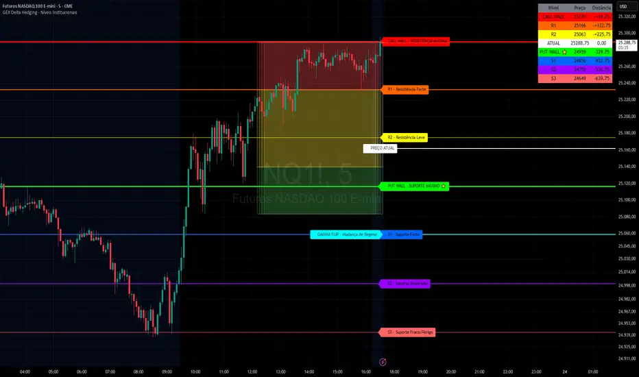 This Pine Script indicator is designed to visualize Gamma Exposure (GEX) levels, Delta Hedging zones, and institutional support/resistance points on your TradingView charts. It helps traders identify key price levels where market makers and institutions might hedge their options positions, potentially leading to price reversals or continuations. The indicator overlays lines for resistances (Call Wall, R1, R2), supports (Put Wall, S1, S2, S3), a Gamma Flip zone, and customizable trading zones (Buy, Neutral, Sell). It also includes alerts for level breaches and a summary table for quick reference.