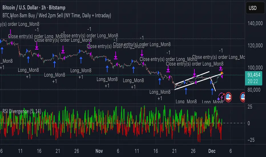 BTC Mon 8am Buy / Wed 2pm Sell (NY Time, Daily + Intraday)