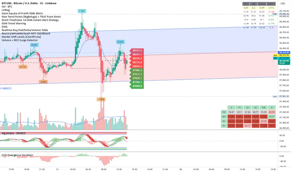 4. SELL alert triggers when price crosses below the 15m EMA and at least one EMA slope is downward.