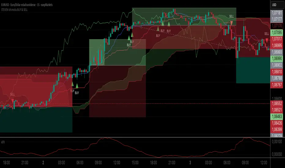 This indicator enhances the traditional Ichimoku Cloud system by adding highly refined BUY and SELL signals based on price–Tenkan interactions, cloud positioning, and multi-step validation rules. It is designed to help traders identify high-probability trend continuation entries while filtering out signals that occur near the Kumo, where market structure is typically uncertain.